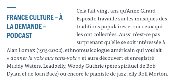 Diffusion ce dimanche à 17h sur France Culture, dans l'émission Toute une vie, de mon documentaire sur Alan Lomax "Alan Lomax (1915-2002), enregistrer le monde", réalisé par Thomas Dutter !